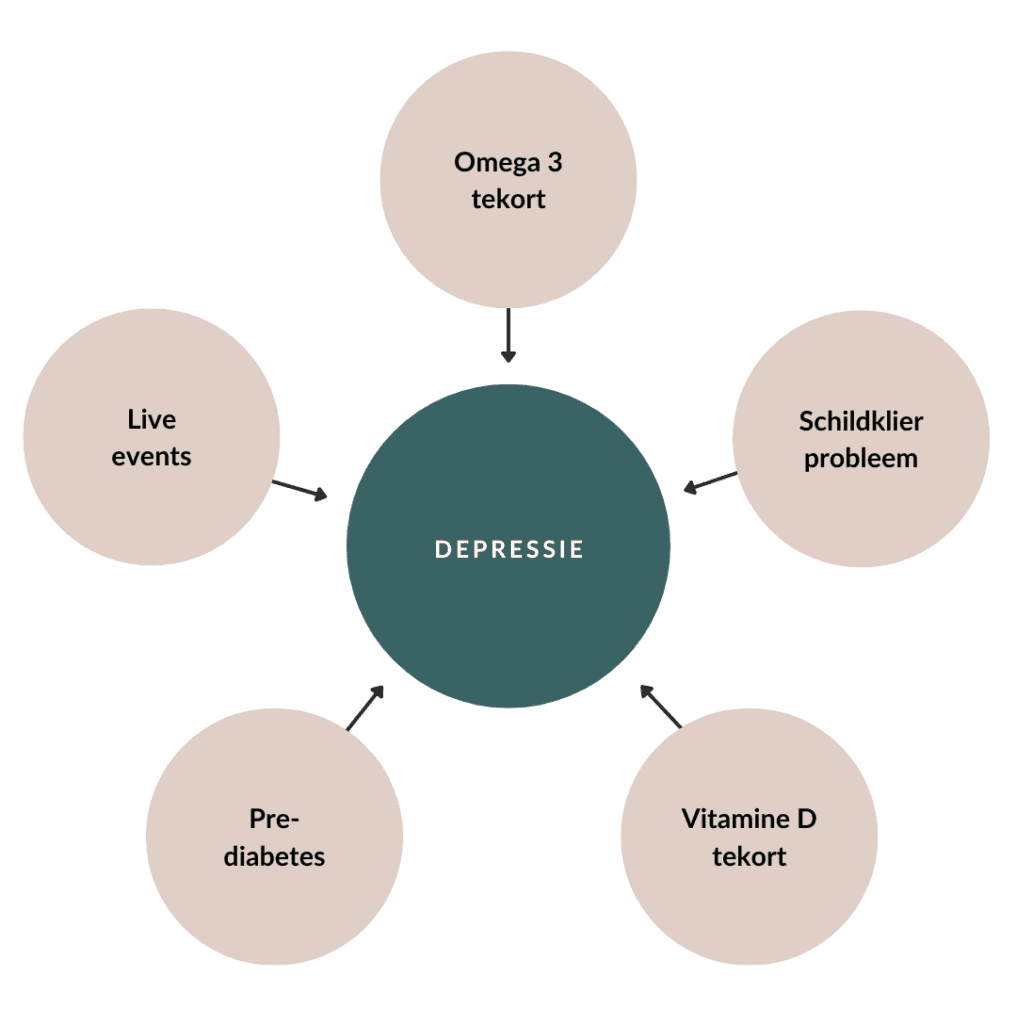 Zo is depressie een naam voor waar je last van hebt. Maar zegt niets over de oorzaak waarom je dat hebt en waarom je je zo voelt. Zie ook deze figuur’